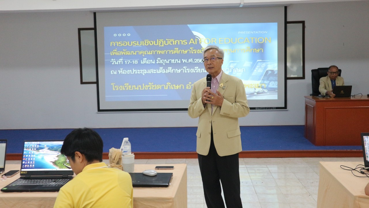 นายสมรักษ์ วงศ์ชัย อาสาสมัครกองทุนการศึกษา (อสส) จังหวัดพะเยา กล่าวต้อนรับคณะครูจาก โรงเรียนในโครงการกองทุนการศึกษาจำนวน 3 โรงเรียนประกอบด้วย โรงเรียนปงรัชดาภิเษก สพม.พะเยา โดยนายสิทธิชัย สิทธิวงศ์ ผู้อำนวยการโรงเรียน , โรงเรียนบ้านสระ นำโดยนายณรงค์ ไชยลังกา และ โรงเรียนบ้านสันติสุข สพป.พะเยา2 นำโดยนายวัลลพ ใจรักษาที่เข้ารับการอบรมเชิงปฏิบัติการ “AI for Education” เพื่อพัฒนาคุณภาพการศึกษา โรงเรียนกองทุนการศึกษา ระหว่างวันที่ 17 – 18 มิถุนายน 2567 ณ โรงเรียนปงรัชดาภิเษก โดยได้รับความอนุเคราะห์จาก นายบุญไทย แสนอุบล เป็นวิทยากรในการอบรม