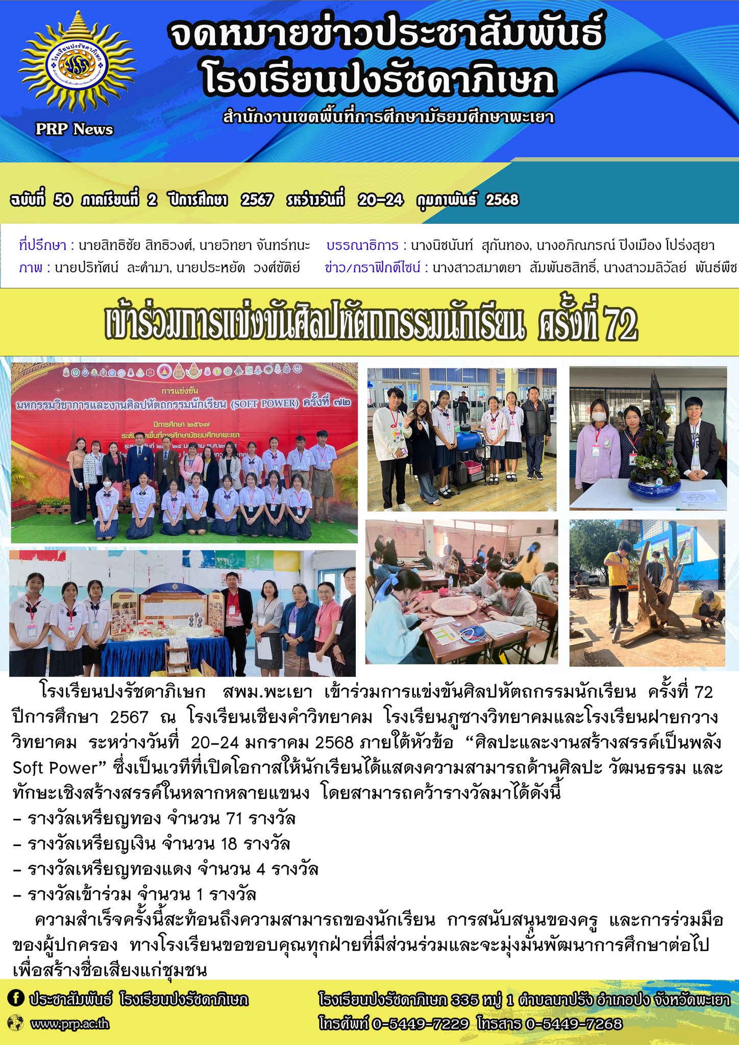 โรงเรียนปงรัชดาภิเษก สังกัดสำนักงานเขตพื้นที่การศึกษามัธยมศึกษาพะเยา ได้เข้าร่วมการแข่งขันงานศิลปหัตถกรรมนักเรียน ครั้งที่ 72 ปีการศึกษา 2567 ณ โรงเรียนเชียงคำวิทยาคม โรงเรียนภูซางวิทยาคม และโรงเรียนฝายกวางวิทยาคม จังหวัดพะเยา ระหว่างวันที่ 20-24 มกราคม พ.ศ. 2568 ภายใต้หัวข้อ “ศิลปะและงานสร้างสรรค์เป็นพลัง Soft Power” ซึ่งเป็นเวทีที่เปิดโอกาสให้นักเรียนได้แสดงความสามารถด้านศิลปะ วัฒนธรรม และทักษะเชิงสร้างสรรค์ในหลากหลายแขนง