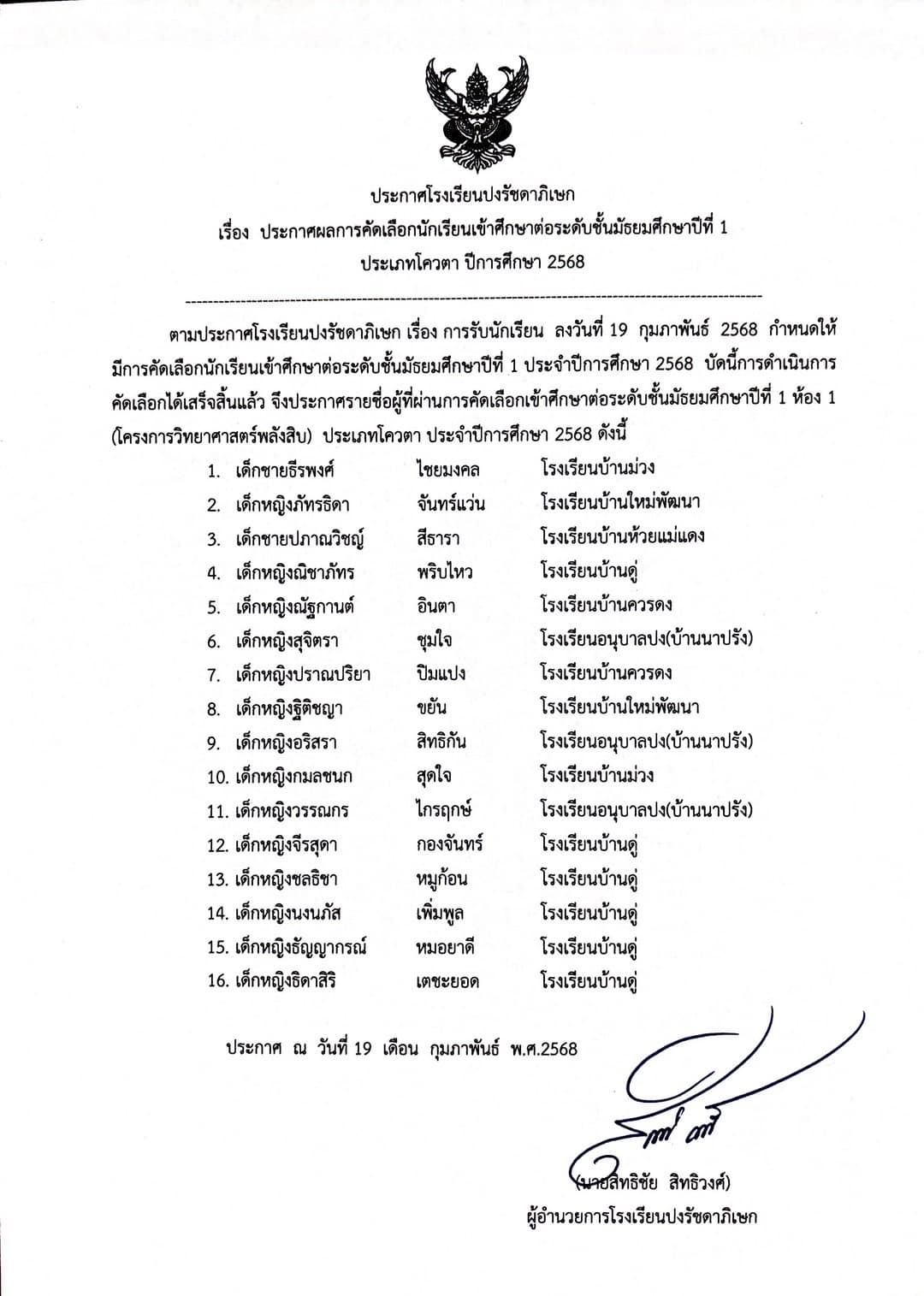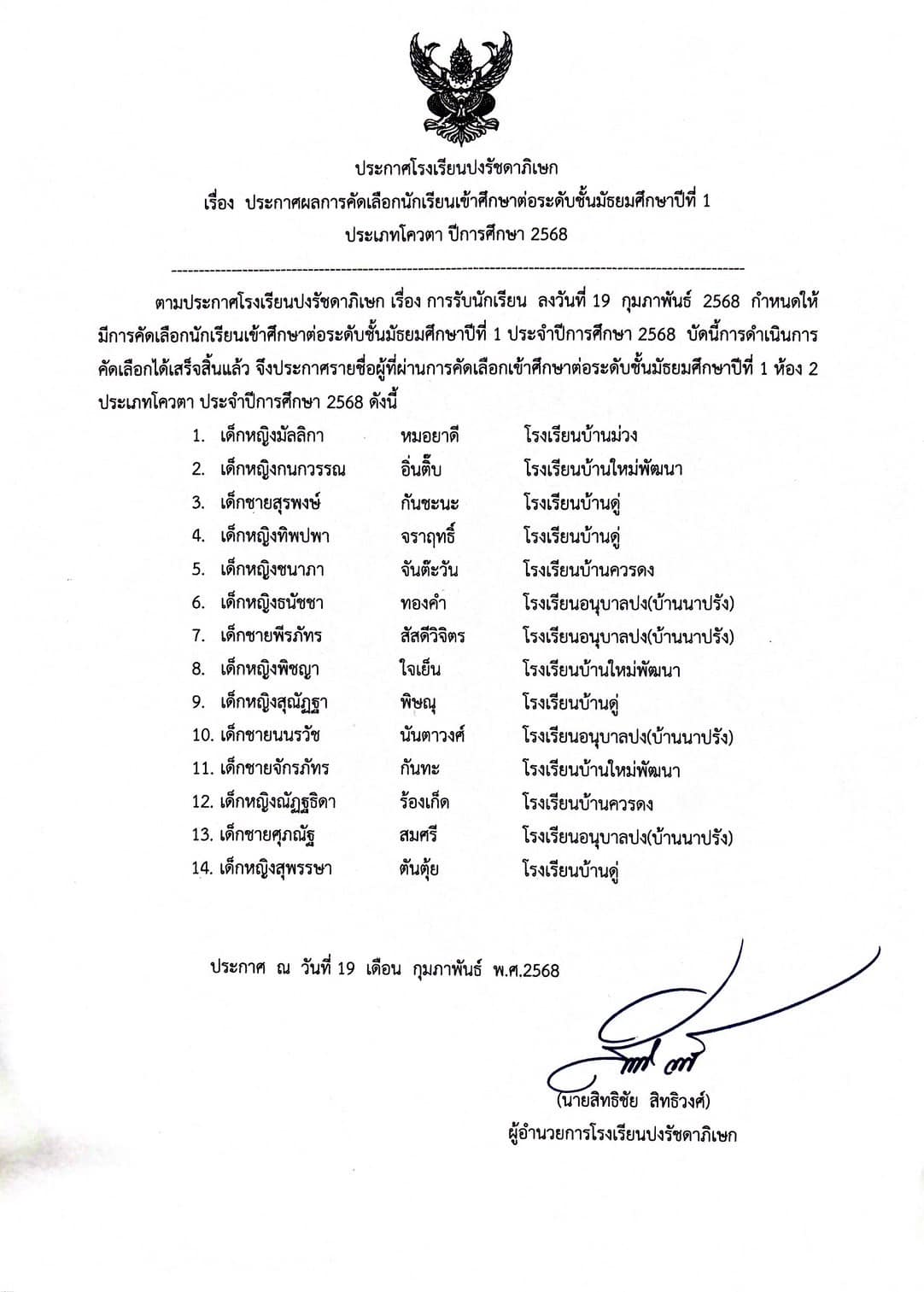 📢 ประกาศผลการคัดเลือกนักเรียนเข้าศึกษาต่อระดับชั้นมัธยมศึกษาปีที่ 1 (รอบโควตา) ประจำปีการศึกษา 2568