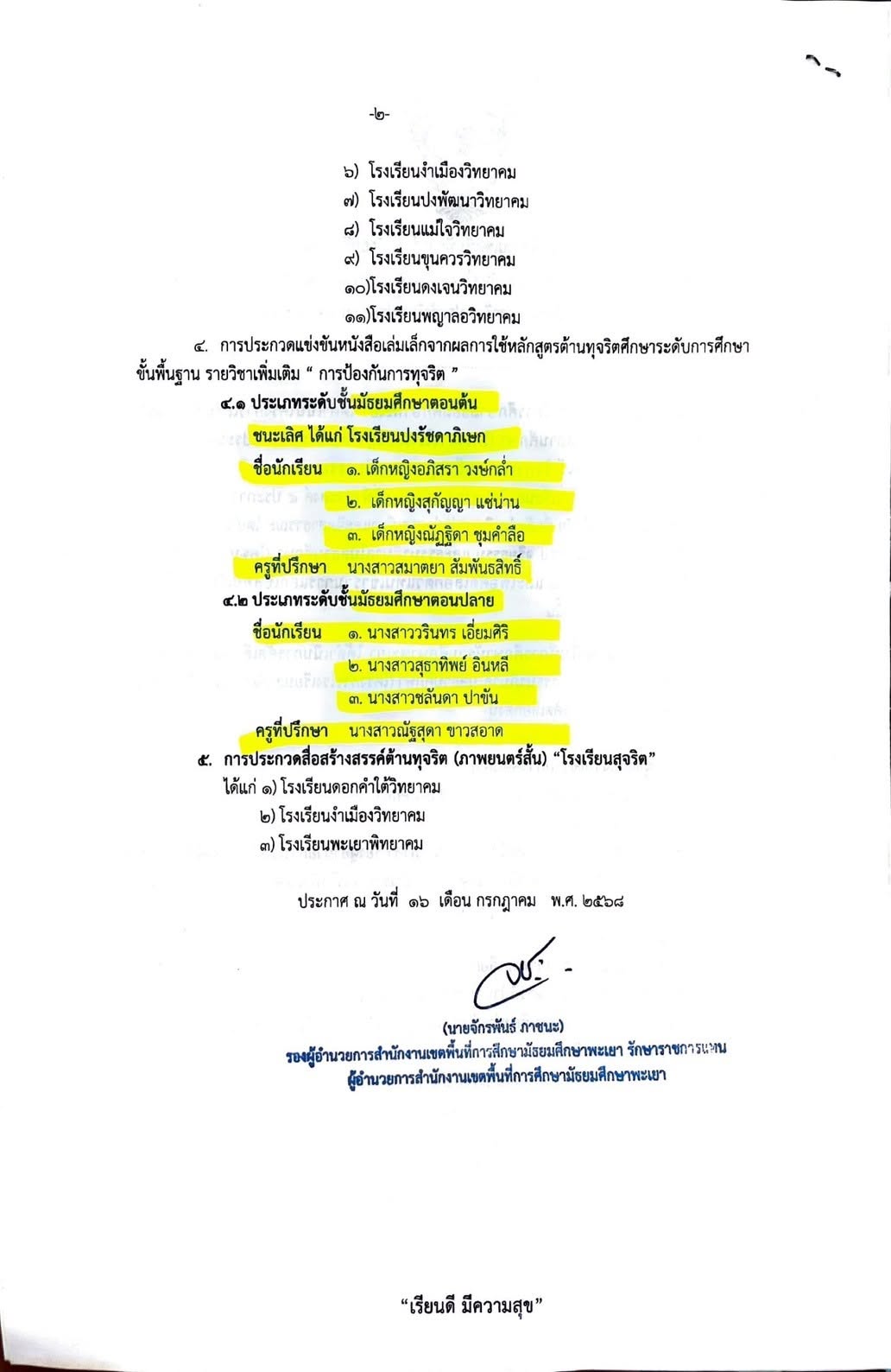 นอกจากนี้ นักเรียนของโรงเรียนยังได้รับรางวัล ชนะเลิศ การประกวดแข่งขันหนังสือเล่มเล็กจากผลการใช้หลักสูตรต้านทุจริตศึกษา รายวิชาเพิ่มเติม “การป้องกันการทุจริต” ในระดับมัธยมศึกษาตอนต้น ได้แก่