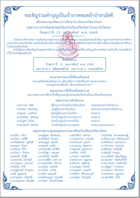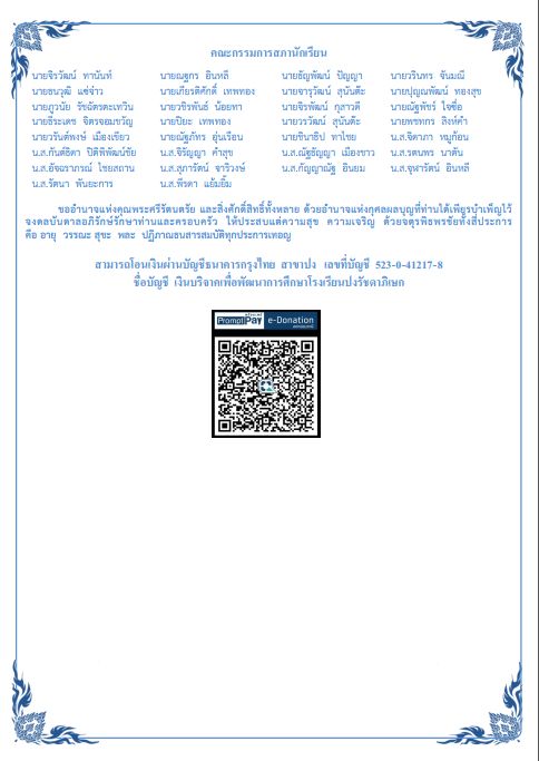 ขอเชิญผู้มีจิตศรัทธาทุกท่าน ร่วมทำบุญถวายผ้าป่าเพื่อพัฒนาการศึกษาโรงเรียนปงรัชดาภิเษก โดยสามารถร่วมทำบุญได้ ดังนี้